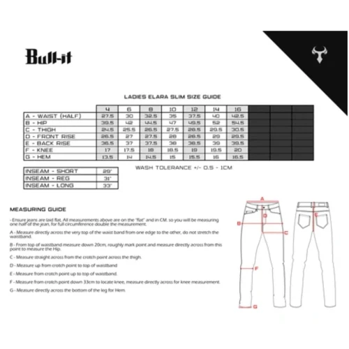 Bull-It Elara har 4-veis stretch denim, og er en single-layer jeans utviklet av Bull-it. Elara gir høy ytelse, har en fin design og overlegen komfort med 4 -veis fleksibilitet og AA -slitestyrke gjennom hele bukse-konstruksjonen.