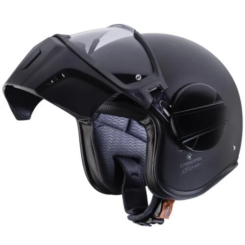 Caberg Ghost er en halvhjelm i fiber som har maske og "briller". Masken kan tas av "brillene" slik at hjelmen kan brukes kun med "briller". "Brillene" er duggfrie. Fronten (maske og brille) åpnes enkelt med 1 hånd. Når "brillen" er lukket hviler de mot kinnet på en skumgummi-pute. Puten kan demonteres eller erstattes av pute med annen tykkelse.