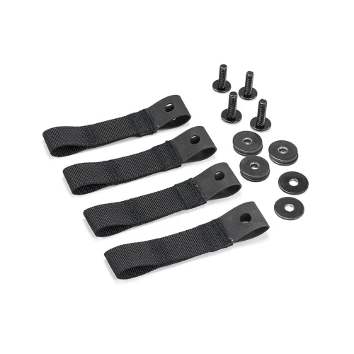 Dette følger med i pakken: 4 x Hypalon løkker - 95 mm - 5 mm stor hull, 4 x M5 skruer, 8 x M5 metall skiver.